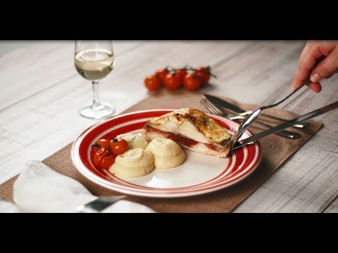 Faça um corte longitudinal nas postas de bacalhau e recheie com o presunto.