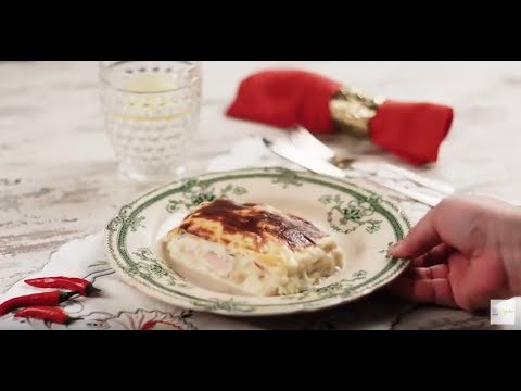 Espalhe metade do puré numa travessa, cubra com as fatias de salmão e de seguida com o molho de endro.